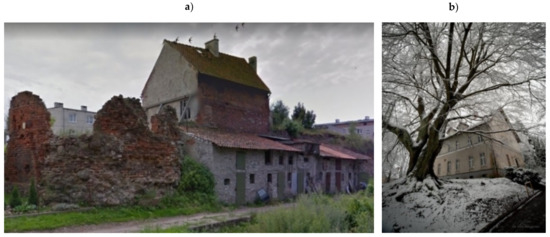In this study, two test objects were selected. They are located in the Warminsko–Mazurskie Voivodeship in Poland. The first object, which is located in the city of Dobre Miasto, is the ruins of a tower with preserved fragments of medieval walls. The second one, located in the city of Olsztyn, is a building of the headquarters of the Institute of Geodesy, University of Warmia and Mazury. The two test objects, object1 and object2, are shown in Figure 4.