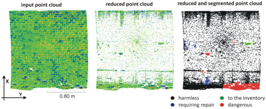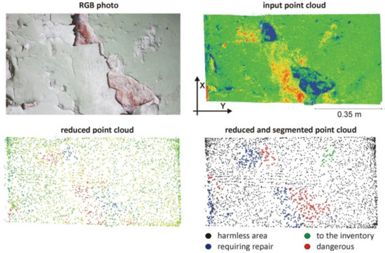 Point clouds obtained from TLS are characterized by very high resolution. Visualization of such a dataset gives the impression of a quasi-continuous surface of the measured object. Almost all visible details of the scanned object can be examined thoroughly. However, there are areas within the object where its structure is less complex; thus, a large number of measured points is not necessary. In order to reduce the number of points in the point cloud and at the same time preserve all necessary data to perform an inventory of the scanned object, automatic down-sampling of the point cloud and its segmentation is proposed. The reduction and segmentation of point clouds is a research topic documented in the literature. In [10], the proposed reduction method was based on curvature, and the authors in [11] showed an adaptive down-sampling strategy and discussed its computational efficiency and quality of segmentation. Different approaches to data reduction were presented in [12]. Here, the focus is on mesh compression. A review of point cloud segmentation and classification is provided in [13]. Detailed descriptions of the advantages and disadvantages of point cloud segmentation can be found in [14].