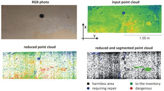 So far, researchers have conducted a thorough and successful research program dedicated to the reduction of datasets from TLS measurements concerning buildings and structures, especially in the context of their technical diagnostics [15,16]. In those studies, the OptD method was applied. The OptD method was used to reduce the number of points in homogeneous areas (surfaces without cracks and cavities) and retain more points where there were defects in walls. In the current study, the OptD method was modified in such a way that, apart from down-sampling of the point cloud, the dataset was segmented. The segmentation consisted of separating groups of points and representing different types and size of changes in the surface of the walls. Analysis of the point clouds was performed in the OXYZ coordinate system, which allowed us to detect recesses (cavities and cracks) in the building wall, or in the OXYI coordinate system (“I” stands for the TLS intensity value), which allowed us to detect local surface changes of the wall, such as discoloration, moisture, and bio-deterioration (lichen and moss). Such changes to the buildings and structures are very often associated with poor technical conditions of the surface. It should be noted that the TLS intensity value depends mainly on the physio-chemical properties of the scanned areas, such as color [17], roughness [18], and saturation [19,20]. The choice of how the dataset is analyzed (in OXYZ or OXYI coordinate systems) depends on the user. It is also possible to perform those two versions of analysis at the same time.