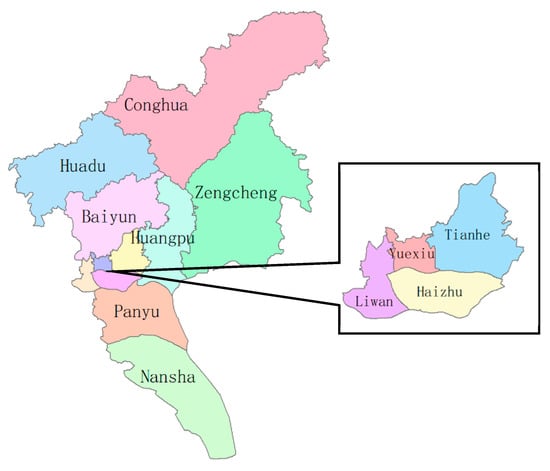 Section 2.2. Subsequently, we mapped four POI categories in four main urban districts of Guangzhou (Liwan, Haizhu, Yuexiu, Tianhe) by using the no-further-process dataset, wherein the POI set only represents POI of storing check-in records, the result of visualization shown as