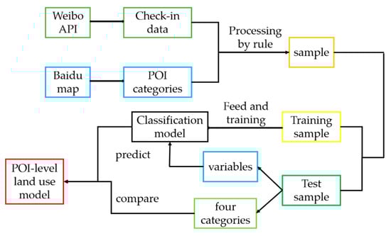 In our study, we only utilized a small part of POI and check-in data for POI-level land use classification. In other words, we finished finer precision work with fewer kinds of data. Specifically, we firstly investigated spatial and temporal patterns of human mobility and activity behavior using check-in data from a popular Chinese LBSN named Sina Weibo and subsequently applied those patterns to predicting the category of POI to refine urban land use classification in Guangzhou, China. Our proposed approach can be potentially applied to classify building functions according to visitors’ human and mobility behavior and buildings’ locational characteristics.