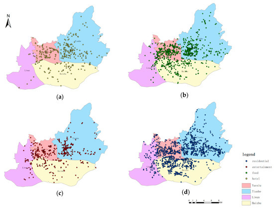 Figure 7, are located at the districts of Tianhe, Yuexiu, and Haizhu, where one can witness the modernization and the prosperity of Guangzhou. Moreover, the POIs of food and residential present a relatively homogeneous distribution in the three regions, while the POIs of hotel and entertainment exhibit a relative clustering distribution in the regions of Tianhe and Yuexiu. The