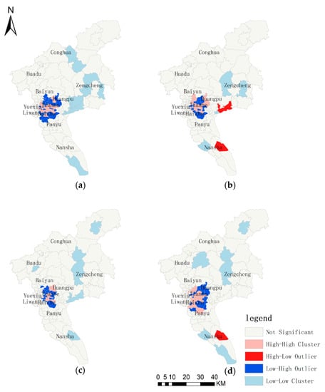 Figure 7 shows a high-level mix of four POI categories, especially in the districts of Tianhe and Yuexiu. It is worth mentioning that Tianhe and Yuexiu are the new town and the old town of the city, respectively, and they are also the most populous districts where a high-level land use mix exists. As the locations of four POI categories were likely to exhibit different spatial patterns, we further examined whether check-in counts of four POI categories were likely to exhibit different spatial patterns as well. Therefore, we utilized local Moran’s