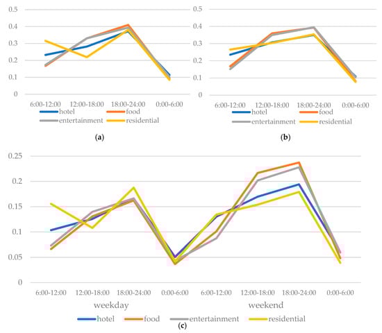 Figure 9a,b) indicate that people prefer to check in at home during the weekday mornings (before going to work) and evenings (after finishing work) and go to enjoy food and entertainment during weekday afternoons or nights, while, during the weekend, human mobility and activity patterns exhibit a relatively disordered state (each POI category reflects a similar active curve). It can be validated by the phenomenon that people generally have a regular daily schedule for work and entertainment on weekdays, while, due to more free time and space to schedule their personalized life, people tend to have a less regular daily schedule on weekends. Subsequently, we plotted the distribution of check-ins among eight time periods after one week was separated into weekday and weekend. More specifically, weekday check-ins and weekend check-ins were both averaged, as there are more weekdays than weekend days in total (e.g., the number of total weekday check-ins was divided by five, and the number of total weekend check-ins was divided by two; subsequently, two results were summed as total data in