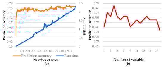 Figure 10a we observed that the building trees beyond approximately 280 did not result in considerable additional performance increase but caused a slight decrease of prediction accuracy; finally, the relatively stable prediction accuracy happened at the tree beyond approximately 700. Therefore, we selected the forest size of 700 as a reasonable trade-off between time consumed and prediction accuracy. Subsequently, we built the model under the quantity of splitting variables from one to 18 (total number of selected features was 19). We could speculate that the performance of RF would be the best when the max number of splitting variables was four, as the illustration of