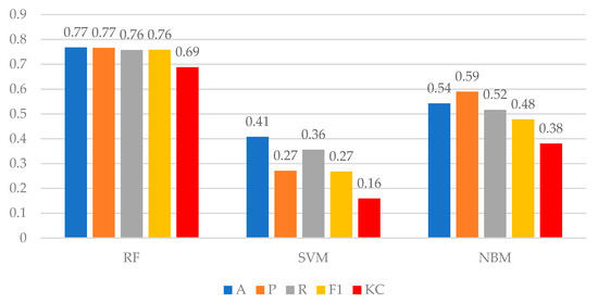 Section 3. In the same rule for filtering check-in data and splitting training datasets and test datasets, we fitted these models by using the same training dataset. Subsequently, we utilized these fitting models to predict POI categories. The prediction results of RF, SVM, and NBM were 76.75%, 40.76%, and 54.24% respectively, which can also be viewed as the accuracy of the three models. In the perspective of accuracy, the RF showed a better prediction performance than SVM and NBM in our study. However, accuracy alone cannot fully demonstrate the performance of these models; we therefore utilized five common classification evaluation indicators, accuracy (A), precision (P), recall (R), F1-score (F1), and kappa coefficient (KC), to show capability of the three models. We calculated these indicators by the equations as follows: