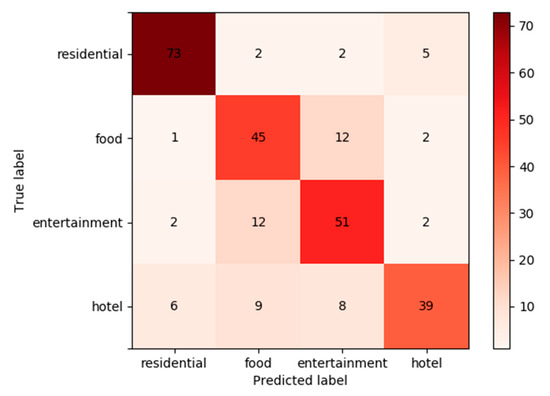 Figure 12. It is obvious that residential had a higher R of 89.02%, while food, entertainment, and hotels only had Rs of 75%, 76.12%, and 62.9%, respectively. It is shown that some POIs of hotels were wrongly predicted to residential, food, and entertainment. According to that, we speculate that the reason is hotels are not only similar to residential in users’ check-in behavior patterns but are also similar to food and entertainment in both POIs’ locational characteristics and users’ check-in behavior patterns, because some large hotels own canteens and facilities such as swimming pools and gyms. Therefore, this caused the similarity in spatial and temporal features of check-ins. Moreover, some POIs of food and entertainment were confused with each other. It is presumably because, in the process of initial classification, we classified large shopping centers as entertainment, while there might be a few canteens in a large shopping center. In the future, we can explore other explanatory variables to clearly distinguish these POI categories to improve the model accuracy.
