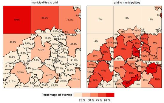 These goodness of fit statistics were used to choose the best fit target grid structure. First, we assessed the overlap between municipalities and the grid structure for different sizes of the grid cells. We take into account both directions of these degrees: municipalities-to-grid (how the municipalities fit into the grid) and grid-to-municipalities (how the grid fits the municipal structure). The difference between calculations of the percentage of overlay for the degree of fit is best documented by visualization in Figure 1. Usually, only one direction is used. In our use case, it is important to have the maximum possible balance between these two directions. Since we search for the best-fit solution and do not have a given target structure, we use the degree of fit as a “two-way fit”.