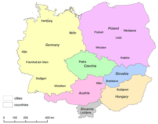 The Central European Region (CER) serves as a case study region for testing our strategy to deal with empirical data. We collected comparable unemployment data available on a very detailed spatial (municipal) level in a relatively big, international geographical area. The study area consists of seven Central European countries: Austria, Czechia, Germany, Hungary, Poland, Slovakia, and Slovenia. These seven countries met our requirements and created a large study area suitable for our methodological aims—it is a compact area with many different regional structures (municipality sizes). It also has the potential for subsequent empirical analyses because of significant spatial patterns of unemployment. We are aware of the problematic perception and delimitation of Central Europe [18], but we use the term Central European Region (CER) throughout the paper. The CER is depicted in Figure 2.