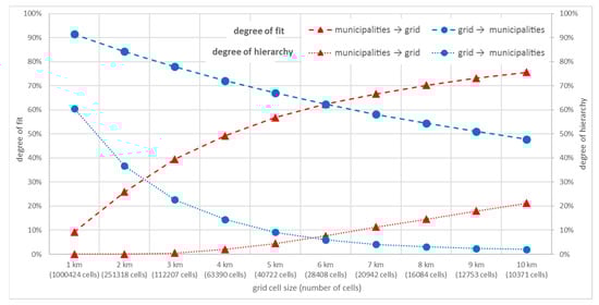 Degree of fit and degree of hierarchy between the regional structure of municipalities and the grid structures with different grid cell sizes.