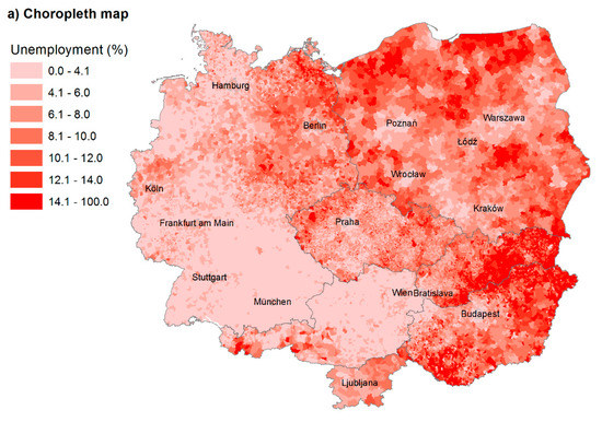 First, the spatial patterns of unemployment in the CER region are visualised by a choropleth map (see Figure 4a). There are 28,937 municipalities. Even from this simple visualization, a sharp difference between unemployment in the west and east is visible, as well as more favourable unemployment levels in bigger agglomerations. However, the map is rather fragmented and, apart from the mentioned results, difficult to interpret. The bigger units dominate and attract our attention (such as Polish municipalities or bigger cities). Moreover, different sizes of municipalities in studied countries do not allow the interpretation of cross-border clusters.