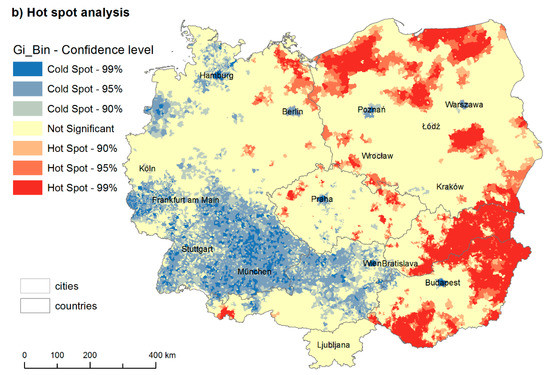 After having the unemployment surface, we can proceed with hot spot analysis, namely the Getis–Ord (Gi*) spatial statistic [23,24]. The hot spot analysis is presented in the form of a cluster map (Figure 4b). For example, if we have the unemployment data, we can study whether unemployment values are more similar in close municipalities. If they are, the positive spatial autocorrelation is present and a cluster (high-high or low-low types) forms. If the values are randomly distributed in space, there is no spatial autocorrelation. We treat the whole CER as one system, thus with one mean.
