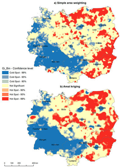 Second, we applied two methods of areal interpolation most suitable for our research, (i) simple area weighting and (ii) areal kriging. We have shown how to correctly implement these methods and discussed the most important issues connected to them. The standard spatial analyses methods, such as hot spot analysis, proved to be more suitable for analysing spatial phenomena than non-spatial methods (see the choropleth map difference). The areal interpolation methods are even more suitable in international regional research. Compared to other methods (such as a choropleth map and hot spot analysis based on municipal data), several important advantages were identified. First of all, areal interpolation does not bring many new insights in cases where the differences of two or more systems (countries) are big, such as in case of the overall difference between West and East. However, in cases where the differences are not that visible, areal interpolation can significantly change the final interpretation. This is visible when the maps created by municipality hot spot analysis and areal kriging are compared. It is specifically important in regions with major regional centres (such as big cities in Poland), which have significantly different sizes. In general, areal interpolation methods are not that affected by outliers (both in terms of extreme values and in terms of extremely different spatial sizes). For our purposes and goals, areal kriging was the best option. However, this does not have to be the same if the research goals are different.