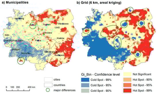 Comparison of hot spot analysis of unemployment in municipalities (a) and grid (b—6 km, areal kriging). Source: © EuroGeographics for the administrative boundaries, European Commission, Eurostat/GISCO.