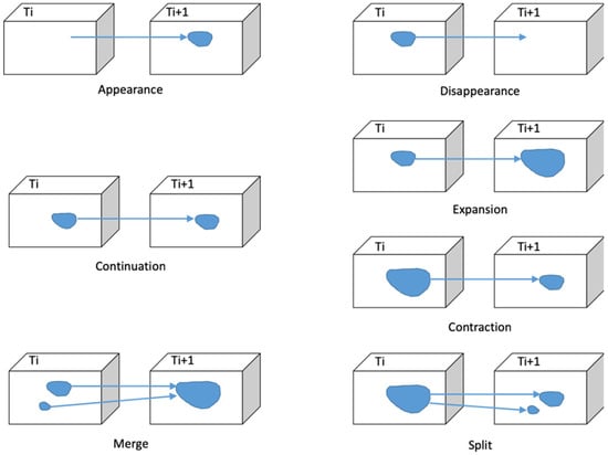 ST-object at consequent timestamps, i.e., appearance, disappearance, expansion, contraction, continuation, splitting, and merging (