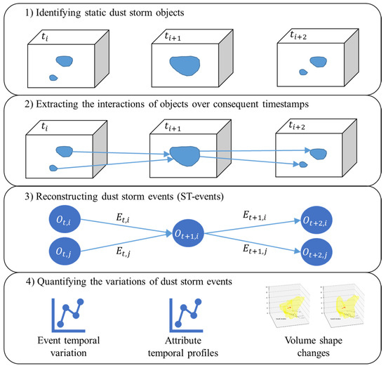43]. The identified dust objects from consecutive timestamps are compared regarding partial spatial overlaps to identify the potential linkages, and a best match is found from all possible combinations of objects from each pair of timestamps.