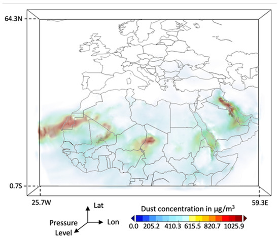 40] maintained at the Barcelona Supercomputing Center. The spatial extent covers North Africa, the Middle East, and the Mediterranean (0.7 S–64.3 N, 25.7 W–59.3 E) with the spatial resolution of ~30 km. The vertical dimension covers 24 layers from the Earth surface to 15 km. The temporal extent covers 12 months, from December 2013 to November 2014, with a temporal resolution of one hour. The simulated variable used in this research is the dust concentration with a unit of μg/m