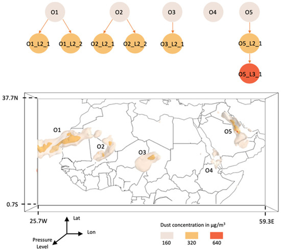 3 (as intensity level 1, 2, and 3) and the volume threshold is 10 voxels. The multi-threshold of dust concentration is referred by the legend of dust concentration maps of model results from Barcelona Supercomputing Center (i.e., 20, 40, 80, 160, 320, 640, 1280, 2650 µg/m