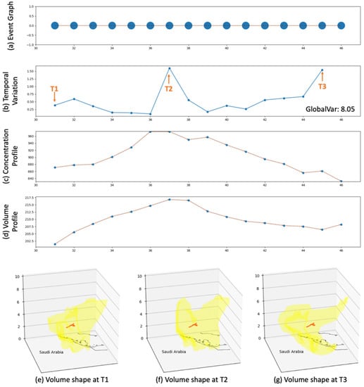 Dust events are then reconstructed by linking ST-objects that have ST-relations among each other. Each ST-event is represented by a graph connecting ST-objects with ST-relations, demonstrating how this event evolves and moves in space and time. The spatial and non-spatial attributes with each ST-object at a particular timestamp are associated with the nodes of the graph, and the weights representing spatial overlap are associated with the edges of the graph. Sample attributes are maintained in the graphs as attributes of the nodes, including centroid (i.e., the center of mass for a dust object), volume (i.e., the amount of cubic space inside of a dust object), and average concentration (i.e., the average dust concentration of all cubic space inside of a dust object). Object hierarchy subgraphs associated with individual ST-objects are integrated into the event graph.