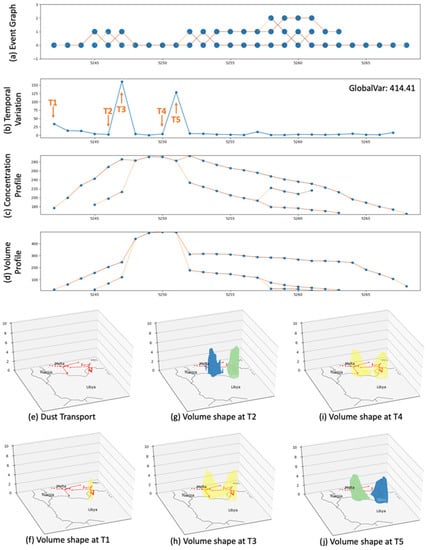 Figure 9f) was transported westward to Tunisia while picking up dust from other dust sources. The highlighted times are instances where the dust event evolves in a significant way, thus llustrating the changes in dust object volume and shape to further investigate at those times (