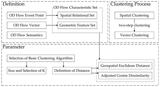 This section introduces the OD flow clustering method based on vector constraints. The method is described in the following three aspects: the definition of related concepts, model parameters (clustering number and distance function), and the details of clustering process. The components of the method are shown in Figure 1.