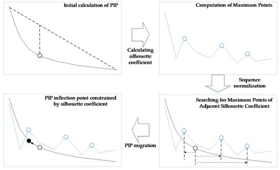 When determining the size of K, the elbow method is affected by subjective factors, and there are multiple local maximum values using silhouette coefficient. Therefore, the SSE perceptually important points algorithm considering silhouette coefficients (SSEPIP) is adopted to automatically extract the optimal clustering number. The process of SSEPIP is as follows.