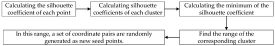 In the traversal process of K value, each new position needs to be selected. In order to optimize the efficiency of clustering algorithm in each cycle, we evaluate the average silhouette coefficients of each spatial cluster and generate new seed points in the range of the spatial cluster with the smallest silhouette coefficients for the next round of calculation. The specific process is shown in Figure 5.