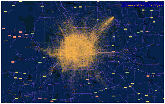 Taxi OD flow is a kind of trajectory with the location information of taxi passengers getting on and off by semantics extraction from taxi trajectory data generated by GPS positioning. Compared with the complex real trajectory, OD flow does not depend entirely on the real road network data and can directly reflect the characteristics of urban residents’ travel. It is an important data source for mining the spatial and temporal activities of urban population [46] (pp. 60–61). The data we used in the experiment are some taxi GPS trajectory data (more than 12 150 pieces) from 6 a.m. to 9 a.m. on 11 January 2008 in Beijing. The data format is the raw taxi GPS trajectory data structure, including the taxi encryption number, GPS feedback time, real-time longitude and latitude, riding status, riding events, speed, direction angle, and other fields [46] (pp. 76–79). In order to facilitate the visualization of clustering results, we use JavaScript + HTML + CSS front-end web development technology to carry out all the experiments and use JavaScript language to write clustering and visualization methods. The visualization of taxi OD flow without clustering analysis is shown in Figure 8.