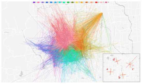 The OD flow spatial cluster generated in the clustering process is shown in Figure 9, and the final clustering result is shown in Figure 10. In order to observe the overall flow trend of 17 clusters, we calculate the OD flow event point mean and OD flow vector mean of all kinds of clusters as representative visualization descriptive indicators. The visualization results are shown in the nested view in Figure 10.