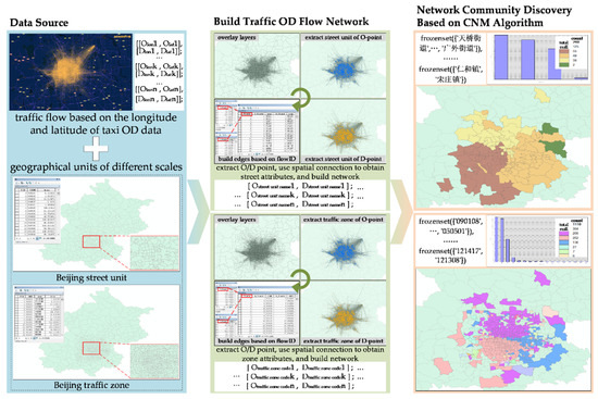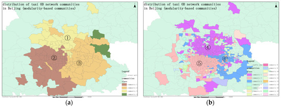 We find communities in the graph constructed by OD flow using Clauset–Newman–Moore (CNM) greedy modularity maximization [58,59]. The corresponding process is shown in Figure 11. The network analysis function is realized by NetworkX software package, and the community visualization is realized by ArcMap. The taxi OD flow network is constructed by taking Beijing traffic zone and Beijing street unit as nodes [60]. Through overlay analysis of different geographic units and OD flow, the OD interactive graph of taxi trip based on geographic units is obtained. Then, we use the most classical module-based community discovery algorithm CNM to get the OD flow community without geographical space constraints, and visually display on a map. Figure 12 shows the community distribution of taxi OD flow network with traffic zone and block (street unit) as nodes, respectively. We annotate the six main communities (the number of nodes in the community is more than 10% of the total nodes), which is represented by ①–⑥.