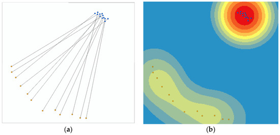 In the algorithm flow proposed in this paper, OD flow is mapped to vector space, and the relative geographic location of OD points changes with the aggregation of OD flow event points. Because only the direction and size of vector are considered in the vector coordinate system, we can set the OD flow event point as the intersection point and move the relative position of OD flow vector. It can be found that the density distribution of OD points is relatively homogeneous. Figure 14b shows the homogeneity of the density distribution of OD points in vector space.