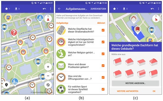 The StreetComplete interface. (a) The map-based overview; (b) the menu for selecting preferred task categories; (c) an example of visual aid supporting the answering of tasks.