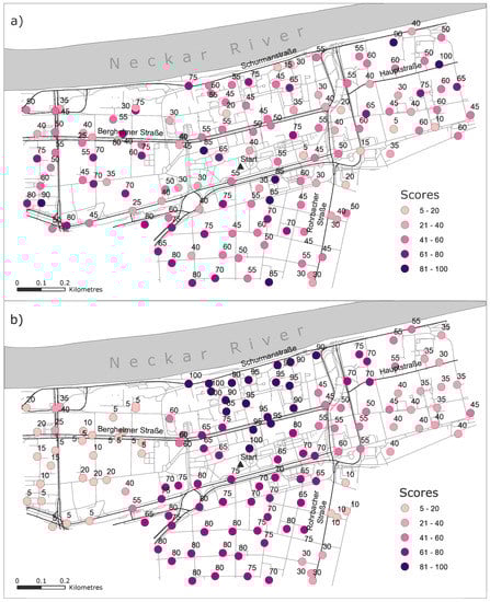 Future research on the role of spatial structure in scoring systems should extend our approach to other cultural and geographical contexts. Our results are only valid for a Western and especially European context and are also limited by a certain local topography. It will be interesting to see how the results vary as the context conditions change. This includes systematically testing interactions between spatial structure in scores and geographical features of a playing field. Similarly, and as already critically noted, future studies should also vary the implementation of the spatial structure in scoring systems (e.g., in terms of the arrangement of the clusters and their size) as well as in terms of the placement of the starting points. This will allow to draw conclusions about possible arrangement and scaling effects in the recognition of applied systems. It should also be investigated to what extent the spatial structure in a scoring system can influence data quality, an aspect that is particularly important in the context of serious games. Another interesting research area that can be related to our results obtained here is the topic of formalising and operationalising place in a human-geographical sense. GIScience has recently begun to investigate this topic more comprehensively [66,69,106,107], and the motivational aspect of this study could also be informative to explanations of how motivating environments influence the perception and conceptualisation of places. Further, in order to overcome the issue of investigating rather small cohorts of players for pragmatic reasons, it would be very interesting to conflate gaming elements with event sampling and other in situ survey techniques [108]. This way, it might be possible to investigate larger groups of players through better integration of the game into everyday routines.