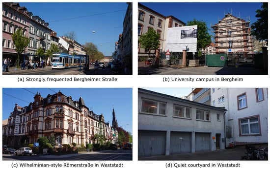 - Knöll, M.; Neuheuser, K.; Vogt, J.; Rudolph-Cleff, A. Einflussfaktoren der gebauten Umwelt auf wahrgenommene Aufenthaltsqualität bei der Nutzung städtischer Räume. Umweltpsychologie 2014, 18, 84–102. [Google Scholar]