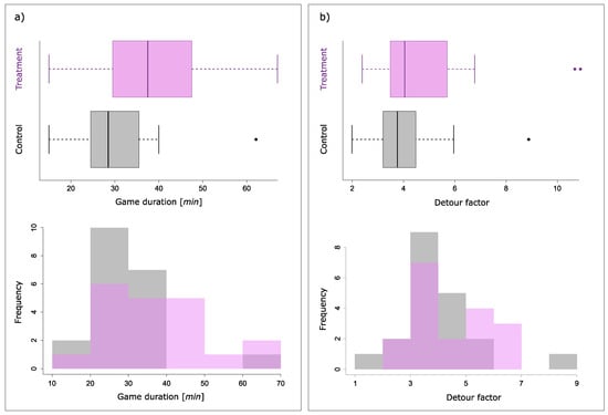 Box plots and histograms of the variables showing significant differences in mean values for the two tested groups. (a) Game duration; (b) and detour factor. Purple colour represents the treatment group, while grey colour indicates the control group.
