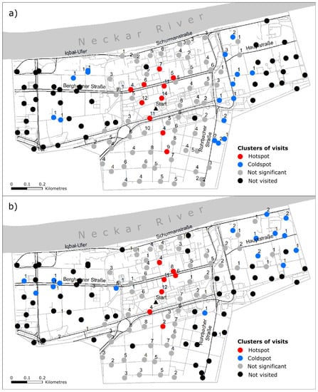 We studied the local movement patterns of the players to obtain more detailed insight into their use of the playing field. The maps in Figure 5 show clusters of the numbers of visits to tasks for both scenarios of the game. The clusters were generated using Getis-Ord , a method that allows to reveal geographic concentrations in the extremes of a distribution [96,97]. In the maps presented, coldspots (i.e., concentrations of small values) indicate areas where visited and unvisited task locations are closely adjacent (unvisited tasks were not included in the cluster calculation). Although both maps show hotspots (i.e., accumulations of high values) in the centre of the field, the main difference between the results for the treatment group and those for the control group is that players from the latter group move more into areas with low values. This effect is most evident in the eastern part of the playing field. While there are a number of coldspots in that part of the map for the control group, the same area shows a large number of unvisited tasks for the treatment group. At the same time, the players of the treatment group visit more locations in the central parts, which spread out to the north and south. These are the more rewarding areas in this scenario, so it seems plausible to observe players from the treatment group visiting these parts of the playing field. What also stands out is that the players in the control group left 51 tasks unvisited whereas the players in the treatment group only left 43 tasks unvisited. These results indicate a possible motivating effect of the geographically clustered high scores.