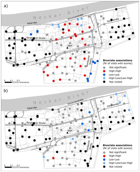 The results described above are further backed up by the results of a bivariate spatial analysis of the task visits and the scores offered. We calculated the spatial correlation between the two variables using the bivariate local Moran’s I coefficient [98] calculated using the number of visits and their geographically surrounding scores. Figure 6 shows that for the treatment group, we find a very strong correlation between visits made and spatially surrounding scores. This is reflected in a large number of high–high links, that is, high numbers of visits found in areas with high scores at the same time. The corresponding global bivariate spatial correlation coefficient is 0.39 and was found to be highly significant. In contrast, there is no such spatial correlation for the control group, which has a non-significant global coefficient of close to the expected value of this statistic. There are almost no high–high links, and the overall pattern of the different types of clustering seems to be more random than with the treatment group. These results support the findings from the hotspot clustering analysis presented above and also provide an indication of a possible correlation between gaming behavior and the underlying structure of the scoring system.