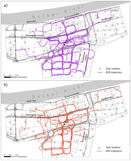 The playing field covers an area of 1.3 square kilometres, which is close to the optimal size of 1.5 square kilometres recommended in previous studies [56] for a playing time of 30–60 min. A playing time of 30–60 min is considered suitable here, as this length does not exhaust the players and at the same time allows sufficient exploration of the playing field. All players started playing the game in a park called Schwanenteich (indicated as ’Start’ in the maps in Figure 2). This starting point is located near the centroid of the area and is about the same distance from all the attractive areas mentioned above. Like the balanced attractiveness of the entire area, the chosen starting point minimises the risk of spatial distortion in the direction of a single above-average attractive part of the playing field. The study was carried out during the semester break. This reduces the probability that students, in particular, might be burdened by routine follow-up activities and thus, less motivated to participate seriously. Further, all participants were advised to play the game for at least 20 min.