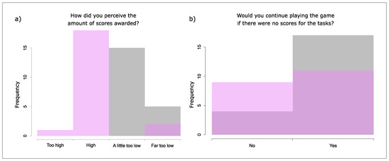 Histograms of responses to two questionnaire questions. (a) Question about the appropriateness of the scores awarded; (b) Question about the subjects’ willingness to play the game without any scores. The purple bars represent the response of the treatment group and the grey bars represent the control group’s response, respectively.