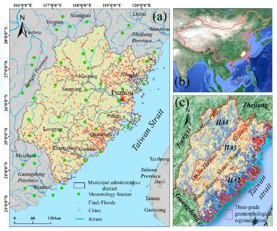 The study area: (a) The spatial distribution of the flash floods in Fujian Province; (b) The geographical position of Fujian in China; (c) Three-grade geomorphic regionalization in Fujian Province.