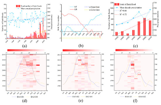 (a) The annual number of flash floods and the mean annual precipitation in Fujian Province from 1951 to 2015 and (b) flash flood mutation analysis using the Mann-Kendall test. (c) The interannual number of flash floods and the mean interannual precipitation in Fujian Province. (d–f) are the monthly number of flash floods in IIA2, IIA3, and IIA4, respectively. The curves represent the mean monthly precipitation of two periods under different geomorphological regionalization.