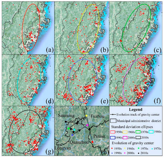 Distribution and gravity center evolution of flash floods during seven periods from the 1950s to the 2010s in Fujian Province. (a–g) are the spatial distributions of Fujian’s flash floods represented in the seven periods from the 1950s to the 2010s. (h) is the evolution track of the gravity center.