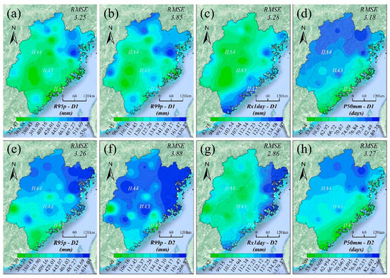 The temporal variation of the precipitation from 1951 to 2015 exhibited an overall increasing trend (Figure 2a). For the seven periods from the 1950s to the 2010s (Figure 2c), there was an obvious increasing trend of precipitation (R2 = 0.66). Precipitation standard normals were 1563.156 mm per year, 1580.379 mm per year, 1617.906 mm per year, 1629.948 mm per year, and 1642.282 mm per year in periods 1951–1980, 1961–1990, 1971–2000, 1981–2010, and 1986–2015, respectively. These analyses further proved that the precipitation was on the rise. Furthermore, the months and the precipitation peaks of the heavy precipitation had significant differences for the different GRs in the IIA2, IIA3, and IIA4 regions, and the precipitation was mainly concentrated in April to September, May to August, and May to June, respectively. As exhibited in Figure 4, in the D1 and D2 periods, the average RMSE values were 3.39 and 3.32, respectively, and the interpolation result could accurately represent the spatial distribution of the precipitation. For the spatial distribution, Figure 4a,b,e,f indicates the increase in the intensity and the larger range of influence of R95p and R99p from D1 to D2. Figure 4c,d reflects the fact that the Rx1day shifted from the southeast to northeast from D1 to D2. Figure 4c,d illustrates the annual count when the precipitation ≥ 50 mm decreased from D1 to D2.