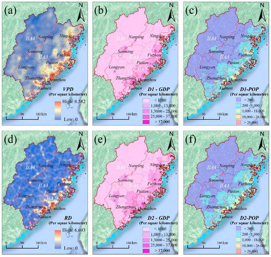 (a) VPD and (d) RD display the spatial distribution of the VPD and RD, respectively; (b,c) present the spatial distributions of GDP and POP in D1, respectively; (e,f) exhibit the spatial distributions of GDP and POP in the D2 period, respectively.