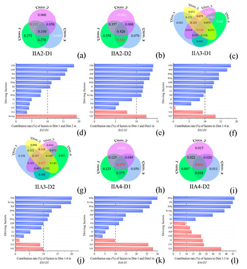 The IIA3 region: In the D1 period, the highest Q values were those of the P50 (Q = 0.208, P < 0.01), R95p (Q = 0.197, P < 0.01), R99p (Q = 0.181, P < 0.01), and Rx1day (Q = 0.152, P < 0.01). As illustrated in Figure 6c,f, the interaction of Dim 1, Dim 2, Dim 3, and Dim 4 contributed the highest R2 value (R2 = 0.126), which accounted for the driving factors of the VPD (18.24%), POP (17.06%), R99p (14.44%), R95p (14.44%), GDP (12.86%), and Rx1day (12.47%). In the D2 period, the highest Q values of the driving factors exhibited the following rankings: Rx1day (Q = 0.344, P < 0.01), VPD (Q = 0.337, P < 0.01), R99p (Q = 0.304, P < 0.01), R95p (Q = 0.304, P < 0.01), P50 (Q = 0.261, P < 0.01), and POP (Q = 0.211, P < 0.01). As displayed in Figure 6g,j, the highest R2 value (R2 = 0.427) was due to the interaction of Dim 1, Dim 2, Dim 3, and Dim 4, and the main contributing driving factors were the VPD (20.08%), Rx1day (19.82%), POP (16.25%), R99p (12.95%), R95p (11.49%), and GDP (10.04%).