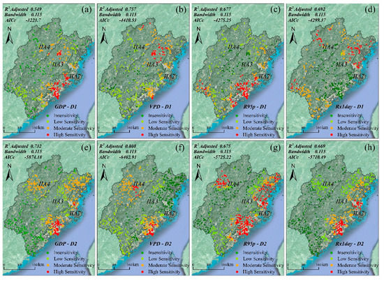 The sensitivity of the flash flood points to human activities (GDP and VPD) and precipitation (R95P and Rx1day) was analyzed by GTWR, and these four driving factors had a greater driving force for Fujian flash floods in the D1 and D2 periods than other nine driving factors. These results show that the mean R2 adjusted value was 0.695, the value of the bandwidth was 0.115, and the Akaike information criterion (AIC) value was less than −3000, which reflected the preferable fitting degree of the GTWR model. From the perspective of the GDP (Figure 7a,e), the sensitive regions increased from D1 to D2. There was low sensitivity and moderate sensitivity in the Ningde areas, and the bordering areas of Sanming and Nanping increased significantly. For the VPD (Figure 7b,f), the moderate sensitivity and the high sensitivity in the bordering areas of Sanming and Nanping increasing significantly. In contrast, the sensitive areas in the southwest of Ningde were markedly reduced. From the perspective of R95p (Figure 7c,g), there was moderate sensitivity and high sensitivity in Ningde areas, and the bordering areas of Sanming and Nanping increased significantly. For the Rx1day (Figure 7d,h), except for the coast of Fujian Province (Quanzhou, Putian Fuzhou, and Ningde), the overall sensitivity of Fujian Province was weakened. From an overall perspective, flash floods were highly sensitive to the GDP, VPD, R95p, and Rx1day in Quanzhou.
