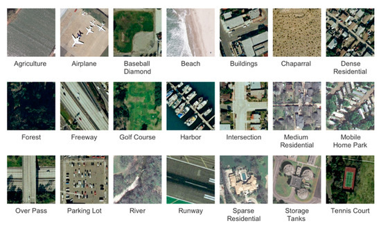 Illustration of the UCMD (UC Merced Land Use Dataset). The UCMD database covers 21 land-cover classes and one image of each class randomly selected from the UCMD are shown.