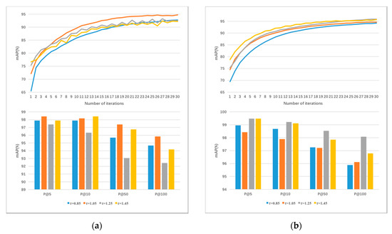 In order to adapt the threshold τ to the PatternNet dataset and improve the performance of different networks, the experiment selects a value of 0.5–1.5 and trains the network with a learning rate of 0.00001. Finally, the results of τ = 0.85, 1.05, 1.25, 1.45 were selected according to the experiment, as shown in Figure 7. The chart shown in Figure 7a is trained under VGG16, while Figure 7b represents the dataset obtained under ResNet50 training. The results show that the optimal parameter τ for VGG16 network is 1.05, while it is 1.25 for ResNet50. As can be seen from the graph, the performance of the network increases with the increase of the threshold τ but when τ increases to a certain threshold, the value decreases. This is because when the threshold value is small, the distance between the query and negative samples is not enough to distinguish them. As the threshold τ increases, negative samples with high similarity will decrease, which will affect the training effect. The results show that when the thresholds are 1.05 (VGG6) and 1.25 (ResNet50), the difference between the positive and negative samples is the best and the model results are the best. In the next experiment, we chose the threshold τ = 1.05 for the VGG16 network and 1.25 for the ResNet50.