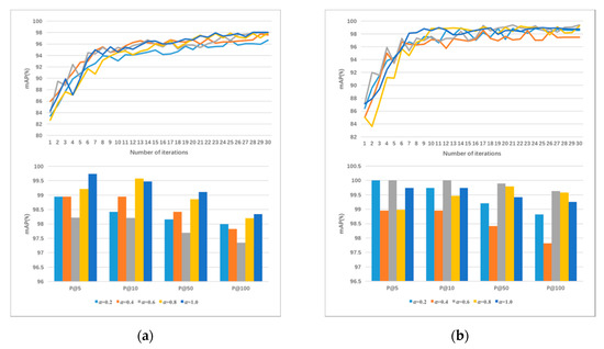 In the experiment, the values of the threshold are 0.2, 0.4, 0.6, 0.8 and 1.0, respectively. The experimental results are shown in Figure 8. The results show that when we set α = 1.0, the best result is obtained in VGG16 (a). And in ResNet50 (b), the best result is obtained at α = 0.6. That’s because when the is small, the distance between the positive and negative samples is not large enough, so that the network after training cannot clearly distinguish them. Conversely, when is too large, the spatial structure inside the positive sample cannot be maintained. Therefore, the network can achieve the best effect only when the value of α can distinguish the positive and negative samples and maintain the positive sample space structure.