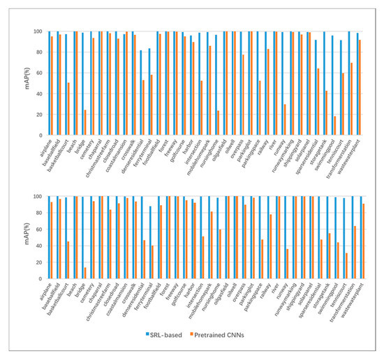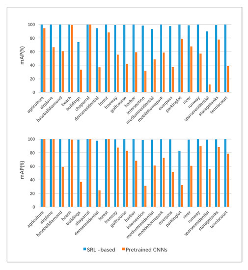 For per-class results, specific results of mAP evaluation which is performed with VGG16 and ResNet50 in the PatternNet and UCMD datasets comparing with the pre-trained CNNs are shown in Table 4 and Table 5. It can be seen that the results of each class of training based on SRL are improved compared to pre-training. The performances of mAP based on the different deep features of VGG16 (top) and ResNet50 (bottom) are visually shown in Figure 10 and Figure 11, respectively. Overall, for every class, the SRL-based features are superior to the pre-trained features on both datasets. As presented in Table 4, in general, for almost every class, SRL-based features outperform pre-trained features. Pre-trained VGG16-based features have particular difficulty in retrieving images of building, intersection and sparser residential, with an average mAP of 25.68%, much lower than that of its counterpart, with 87.4% for the SRL-based features on the UCMD dataset. Meanwhile, on the PatternNet dataset, Pre-trained VGG-based features have particular difficulty in dense residential, intersection and parking lot, with an average mAP of 29.35%, reach up to 93.8% for SRL-based features. Pre-trained ResNet50-based features perform poorly on classes like bridge, nursing home intersection and runway, with an average mAP of 26%. This value for SRL-based feature is 98.38% on the UCMD dataset. While on the PatternNet dataset, pre-trained features are not performance well in bridge, tennis court and ferry terminal, with an average mAP of 28.27%, while 95.11% for SRL-based features, which further demonstrates the superior performance of SRL-based features for CBRSIR. As can be seen from Figure 10 and Figure 11 that SRL-based features outperform much better than pre-trained features for all the classes. At the same time, the results on the PatternNet are better than UCMD in both networks and ResNet50 outperformed VGG16 for both datasets.